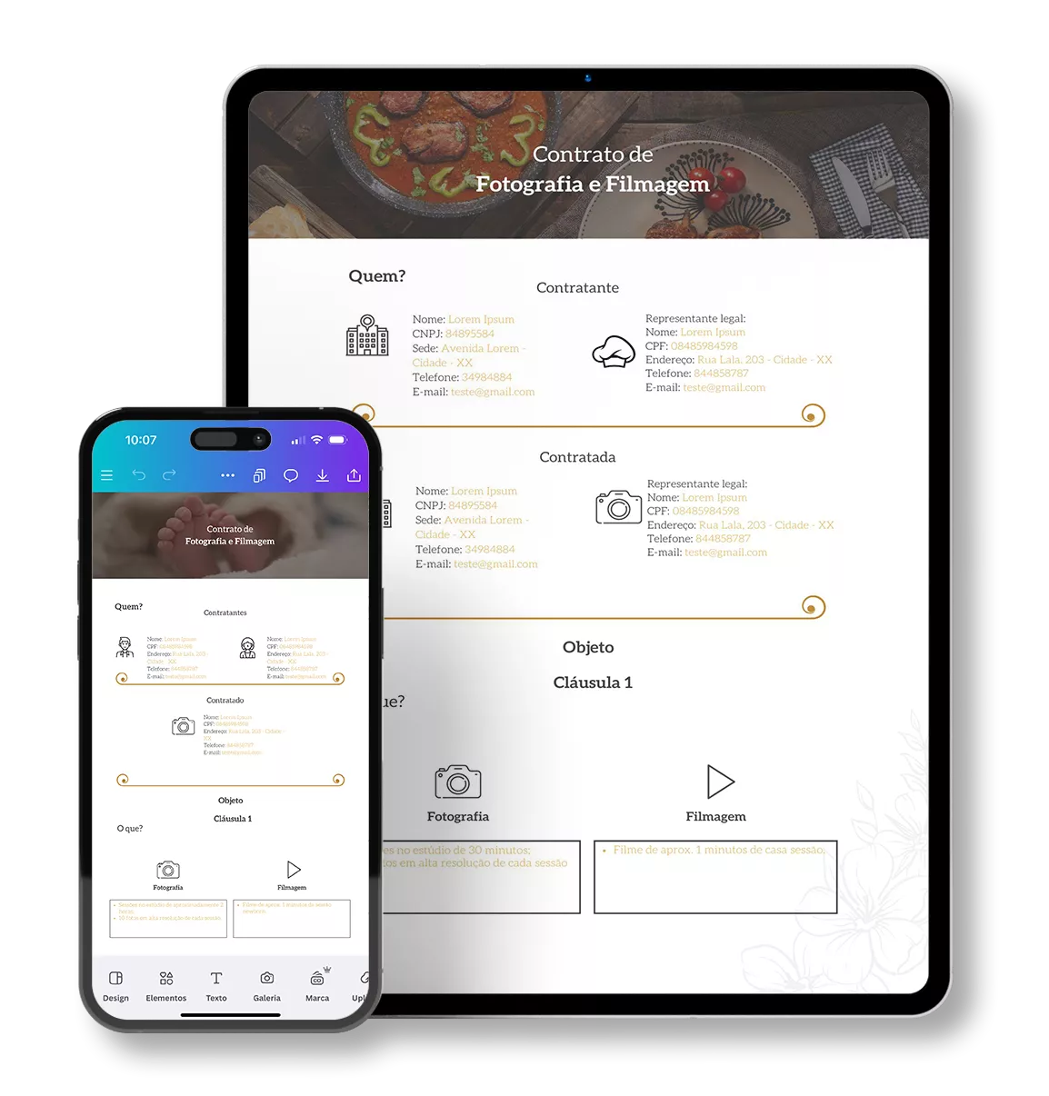 Quer colocar sua logo? Muda. Quer trocar cor, fonte, arrastar, colar foto? Manda ver. Os contratos são seus, prontos pra vestir a sua marca e proteger o seu trabalho.