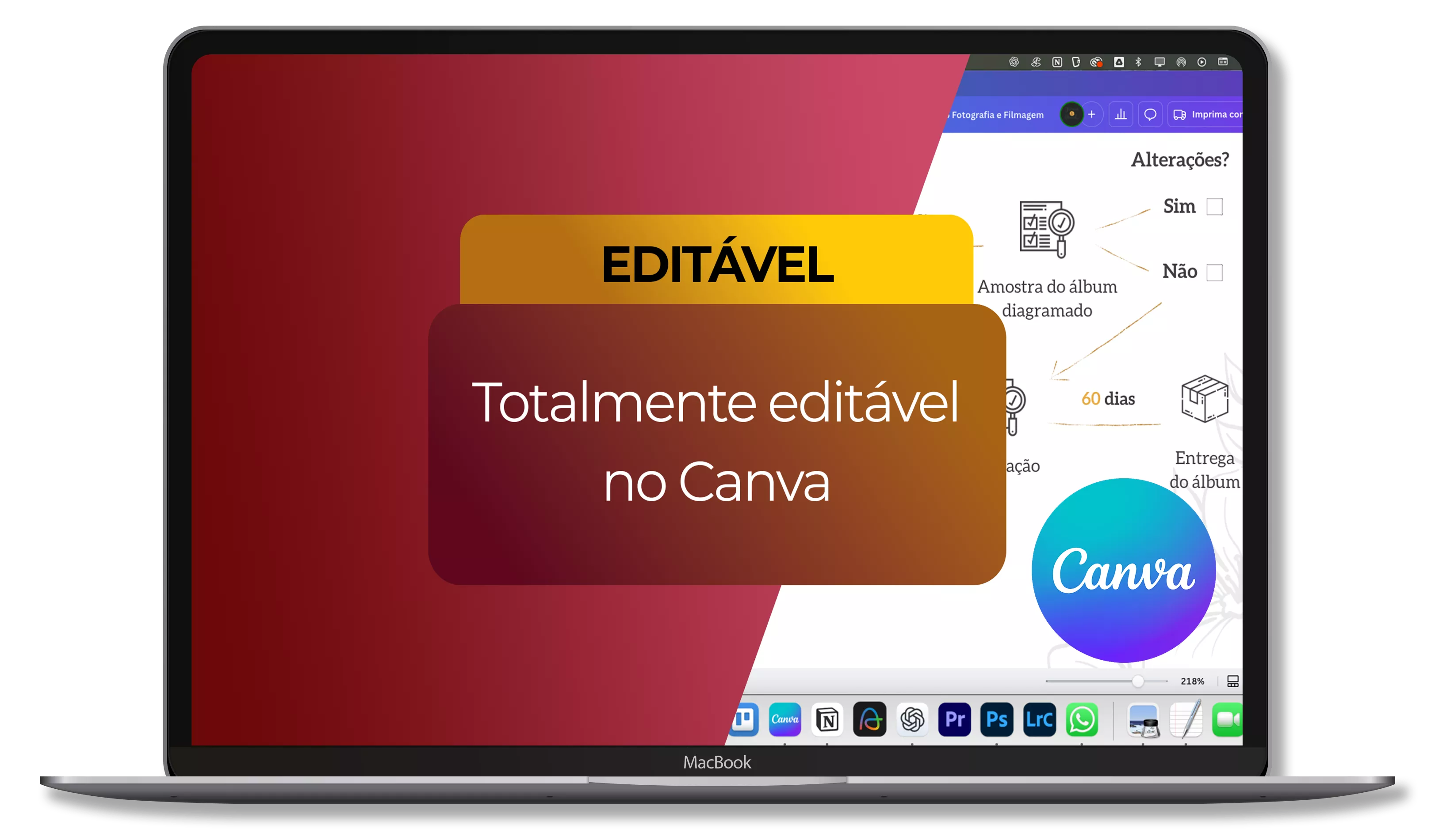 Todos os modelos são entregues no Canva e foram pensados pra você adaptar com a sua identidade visual. Dá pra trocar cores, fontes, colocar sua logo, incluir informações do seu estilo de atendimento… tudo isso sem perder a estrutura profissional do contrato.
